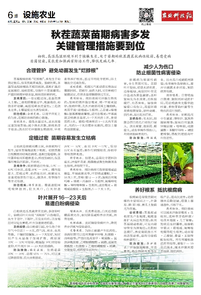 初秋,高温高湿环境不利于植株生长,处于苗期的秋茬蔬菜抗病性较弱,易遭受病原菌侵染,菜农需加强病害防治工作,降低发病几率。