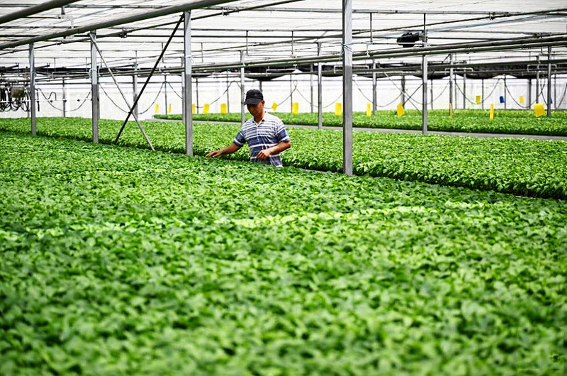 日前,工作人员在安徽省马鞍山市和县绿缘温室科技有限公司管护辣椒秧苗。