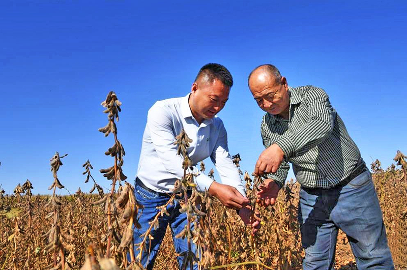 9月29日,在内蒙古自治区兴安盟扎赉特旗音德尔镇,扎赉特旗雨之润农牧业专业合作社负责人朱振宇(右)和中国种子集团技术人员在田间查看即将收获的大豆。