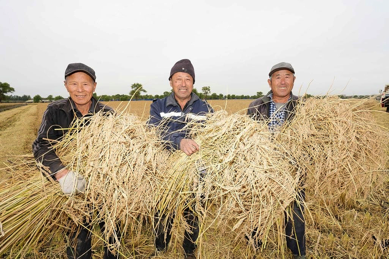 10月11日,在位于黑龙江省哈尔滨市的北大荒集团闫家岗农场有限公司,农户抱着刚收获的水稻合影留念。