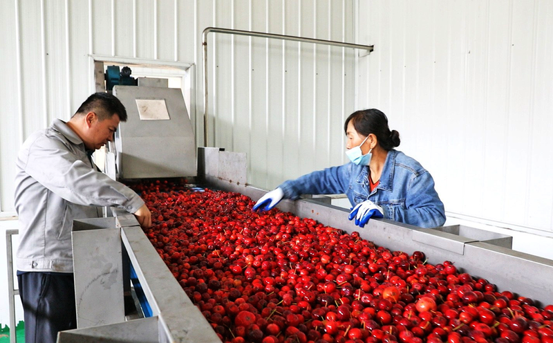 一大早,府谷县哈镇糜茬墕村村民王喜林便拉着海红果赶来。经品质查验、称重后,红彤彤的果实进入生产车间,将销往周边及全国各地。“我连续十多年来这儿卖果,每年能卖1万多斤、收入1万多元,厂子还送农药、喷雾器等农资农具。”王喜林说。