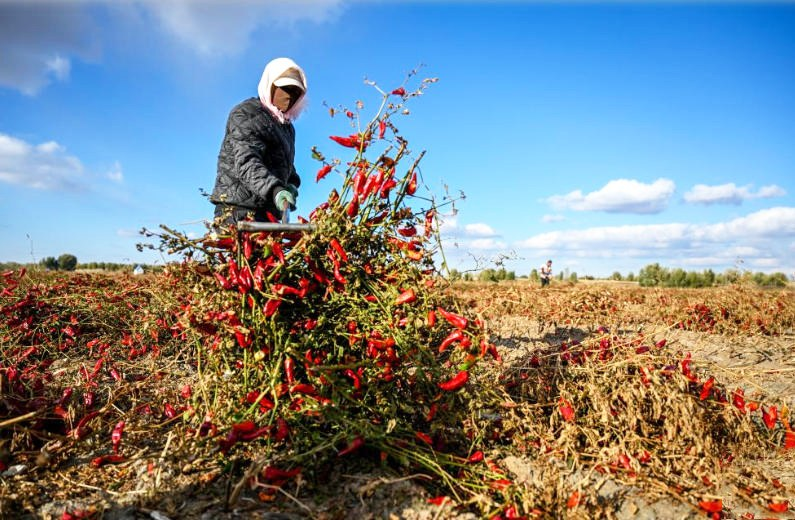 近日,内蒙古通辽市开鲁县迎来红干椒收获季。开鲁县享有“中国红干椒之都”之美誉,当地的红干椒皮红肉厚、品质优良,畅销国内外市场,近年来全县红干椒种植面积稳定在60万亩。图为10月19日,在通辽市开鲁县东风镇六合堂村,村民在田地里晾晒红干椒。
