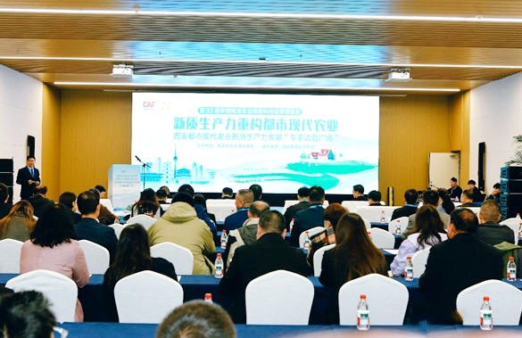 图为会议现场 10月25日,第32届杨凌农高会现场,西安都市现代农业新质生产力发展“专家话题广场”活动掀起智慧风暴。陕西省市农业农村部门负责人、国内农业领域权威专家、西安农业企业代表等近百人共聚一堂,以“新质生产力重构都市现代农业”为主题,共绘西安都市农业高质量发展蓝图。现场不仅发布精准农业新品,更签订农业人工智能合作协议,标志着西安农业数字化转型迈入新纪元。