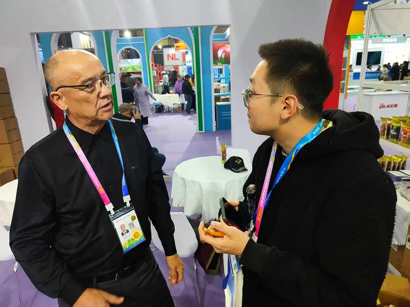 10月24日,塔吉克斯坦杏和公司负责人普洛特·阿舒罗夫(左)介绍自己参加第32届中国杨凌农高会的相关情况。 正在中国“农科城”杨凌举行的第32届中国杨凌农业高新科技成果博览会上,塔吉克斯坦杏和公司负责人普洛特·阿舒罗夫的摊位前人头攒动。他带来的杏干、桑葚果糕、果茶等产品,颇受展会观众青睐。