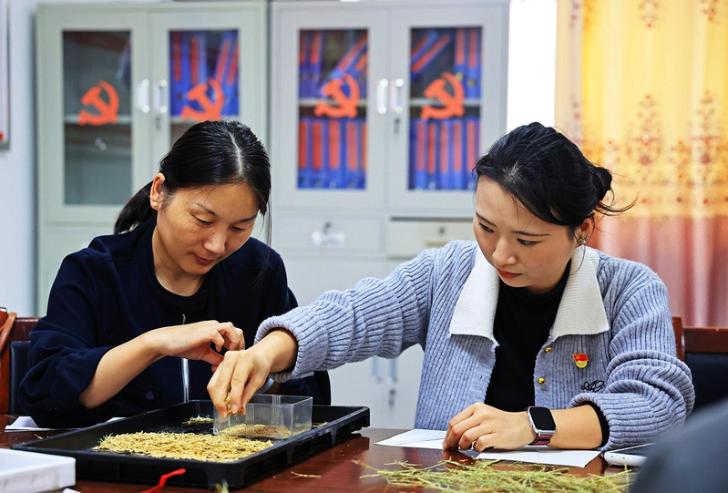 10月29日,安徽省宿松县省属农垦华阳河农场农科所内,农场场部党员干部正清点水稻穗粒数,开展水稻考种作业。