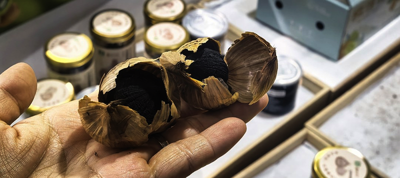 10月28日,杨凌农高会B馆的金乡大蒜主题展区里,一瓶外皮乌黑、果肉呈深褐色的独头蒜,刚一摆上展台就吸引了大批参会群众驻足——这可不是“坏了的蒜”,而是经过特殊工艺处理的黑蒜。它入口没有传统大蒜的辛辣刺激,反倒带着清甜软糯,连“怕蒜臭”的参会群众都忍不住尝了一口。