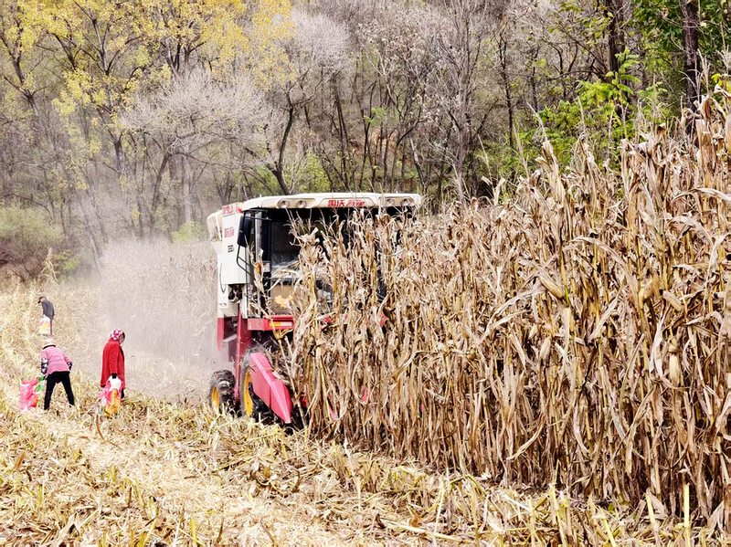 11月8日,陕西省彬州市永乐镇马家河村,玉米收割机轰鸣声此起彼伏,农民穿梭于田间地头抢收玉米,确保颗粒归仓。