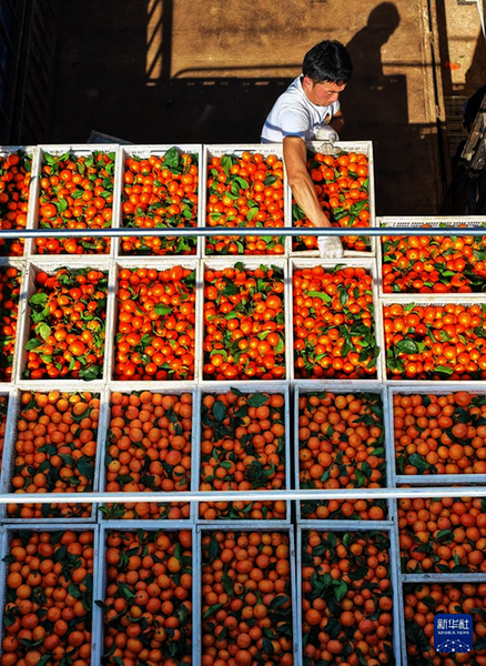 11月15日,在位于湖南省衡阳市衡南县花桥镇的源氏农林柑橘种植基地,务工人员装运砂糖橘。