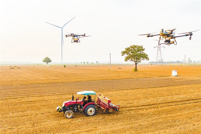 图为近日,在睢县董店街道皇台村高标准农田内,农技人员正在操控植保无人机和播种机在田间劳作。