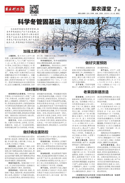 为加强苹果园冬季科学管理,给来年苹果健康生产打下良好基础,全国农业技术推广服务中心联合国家苹果产业技术体系研究制定苹果园冬季生产技术指导意见,供广大基层技术人员、苹果种植户参考使用。