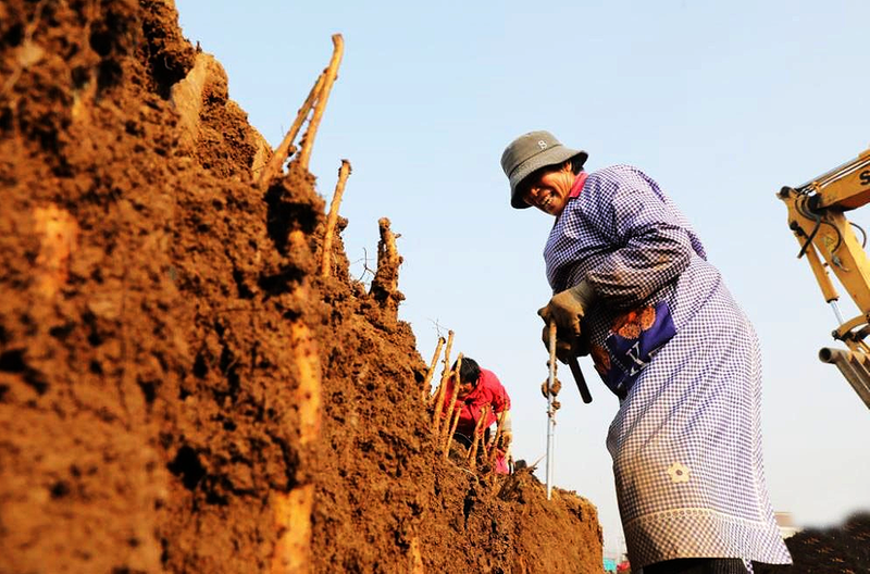 12月11日,河南省焦作市温县番田镇白沟作村农民在山药种植基地收获铁棍山药。