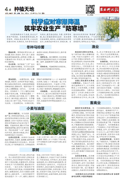 当前寒潮降温天气来袭,农业生产面临严峻考验。各领域需精准施策,科学防御。种植业要分类护苗,小麦油菜需灌水补墒、化调促弱,马铃薯做好覆盖与排水,蔬菜通过覆盖、冬灌、设障等保暖,高山茶园提前防范冻害。渔业需强化保温增氧,圆形池、水槽养殖适时停喂控水,池塘养殖加深水位、搭建大棚。畜禽业重点筑牢栏舍“保温盾”,优化饲养管理,加强疫情巡查。广大农户应紧盯天气预警,落实防寒措施,最大限度降低寒潮影响,保障农业生产稳定。